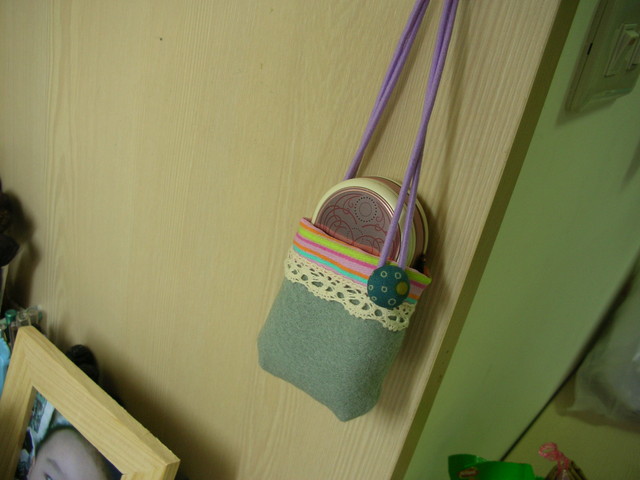 這個手機袋結合不織布、條紋棉布、跟日本進口的蕾絲