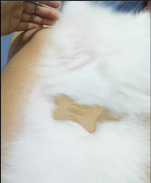 狗牌夾在兩組釘扣中間不會歪來歪去~這樣不管狗骨頭再上還下都有毛孩子的名字喔~XDD